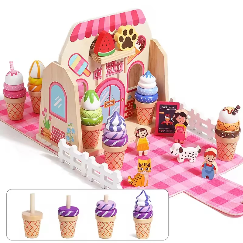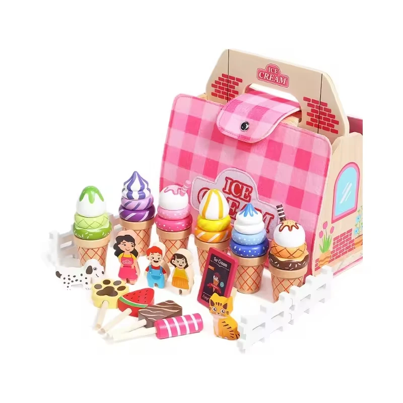 Wooden Ice Cream Shop Play Set Pretend Food & Kitchen Accessories with Carrying Case for 3+ Year Olds for Boys & Girls